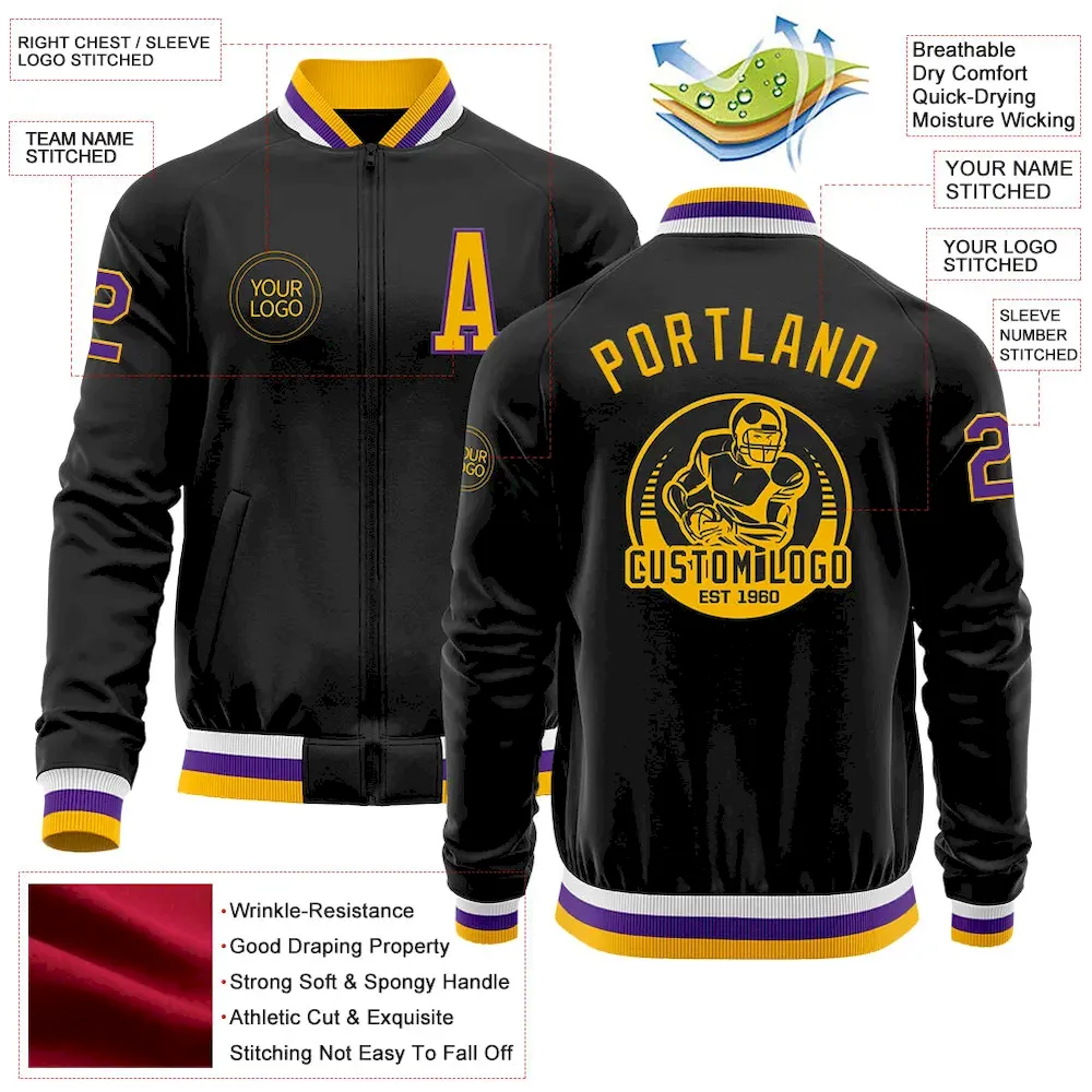 Home Jacket Back Logo Custom Black Gold-Purple Bomber Varsity Letterman Zipper Jacket