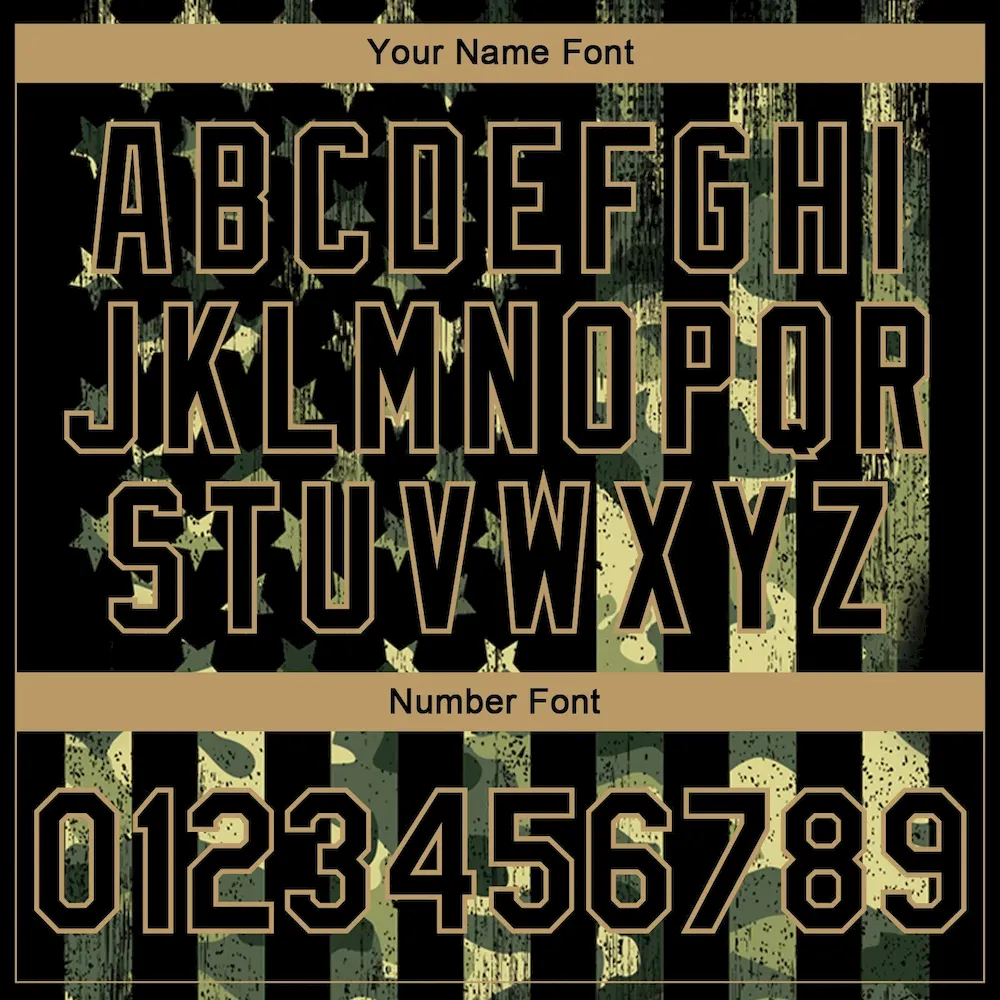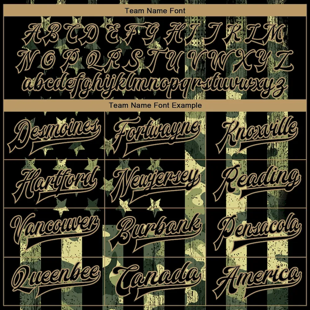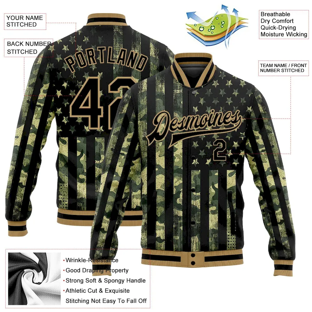 Custom Camo Black-Old Gold American Flag Fashion 3D Bomber Full-Snap Varsity Letterman Salute To Service Jacket